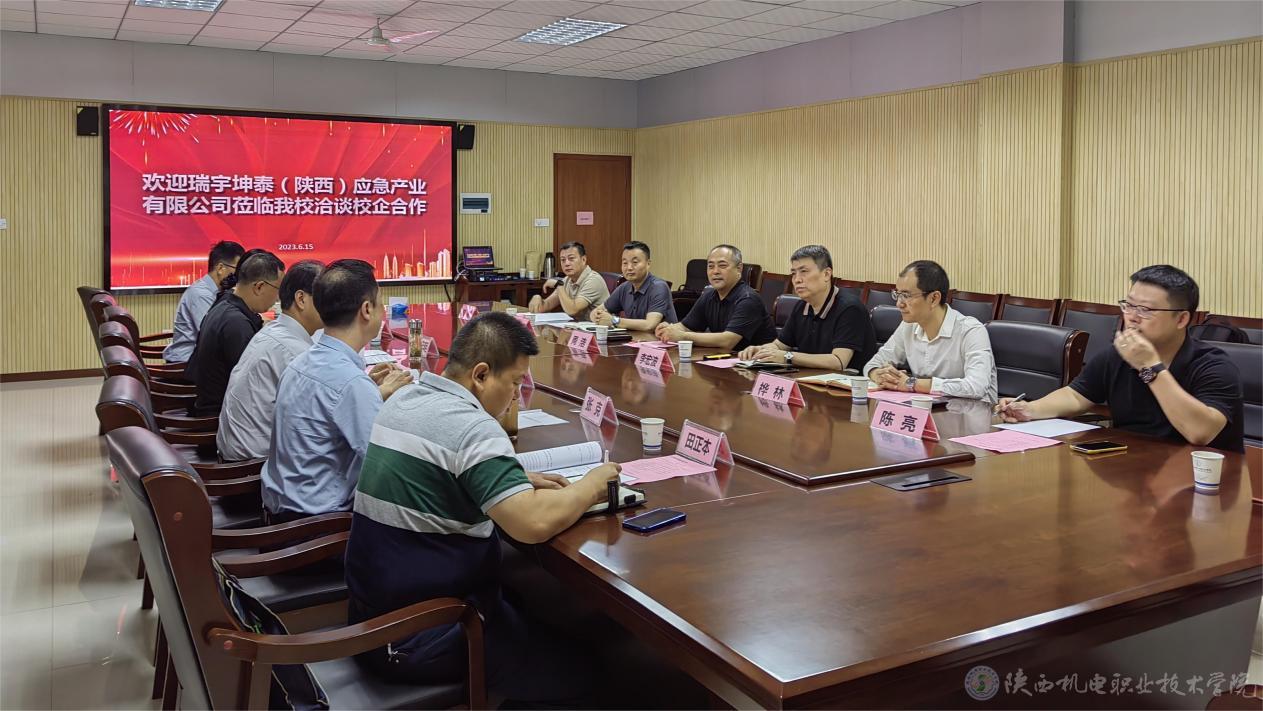 为推动产学研协同创新,寻求校企合作共赢、共谋发展的良好局面,深化产教融合发展,促进高素质应用型人才培养。2023年6月15日,瑞宇坤泰(陕西)应急产业有限公司董事长周浩一行7人莅临我校洽谈校企合作事宜。党委书记伊逊智,党委副书记、院长向纪明,党委副书记、纪委书记陈红梅,党委委员、副院长张克等接待了周浩一行,并举行会议。会议由副院长张克主持。